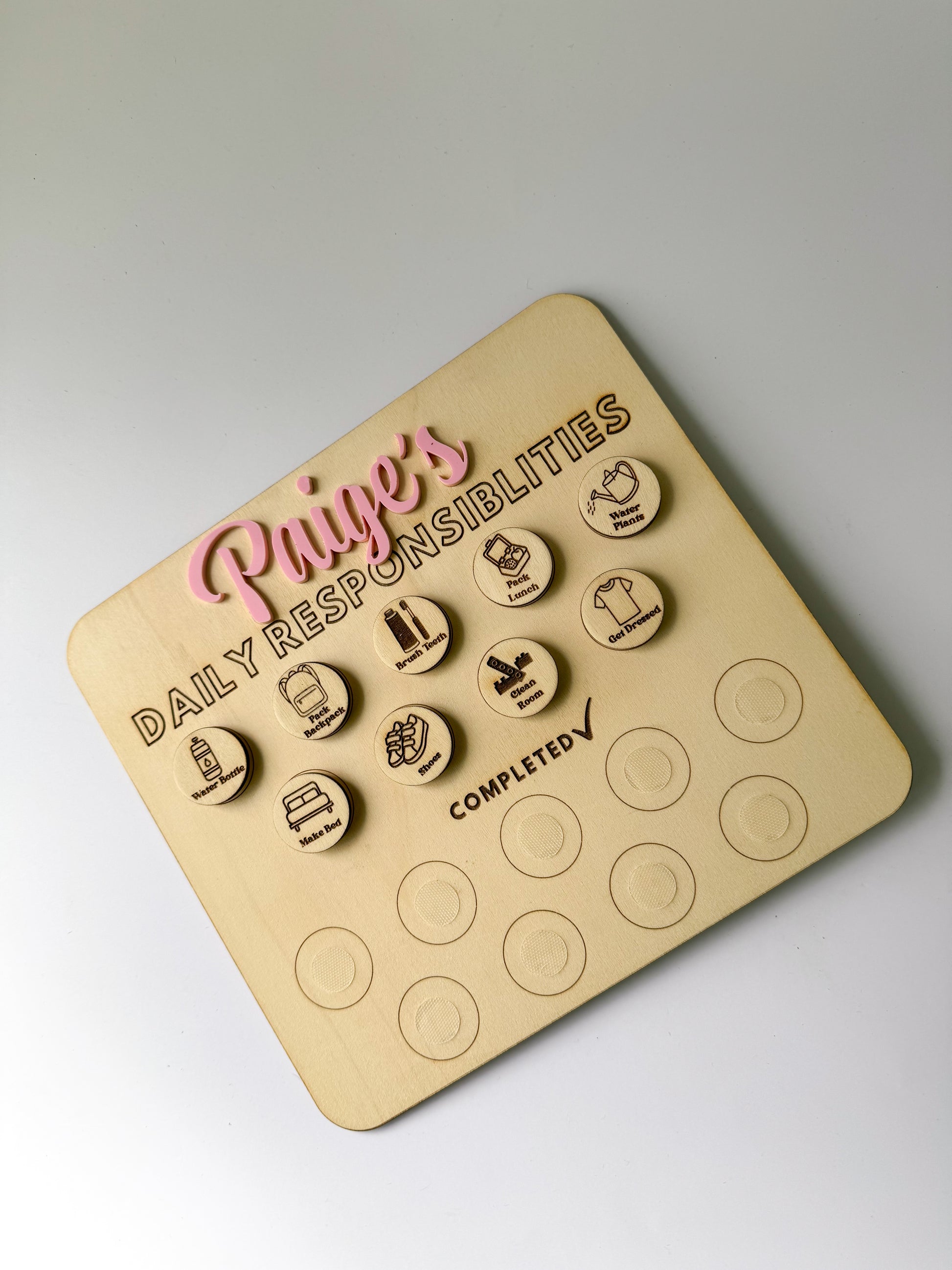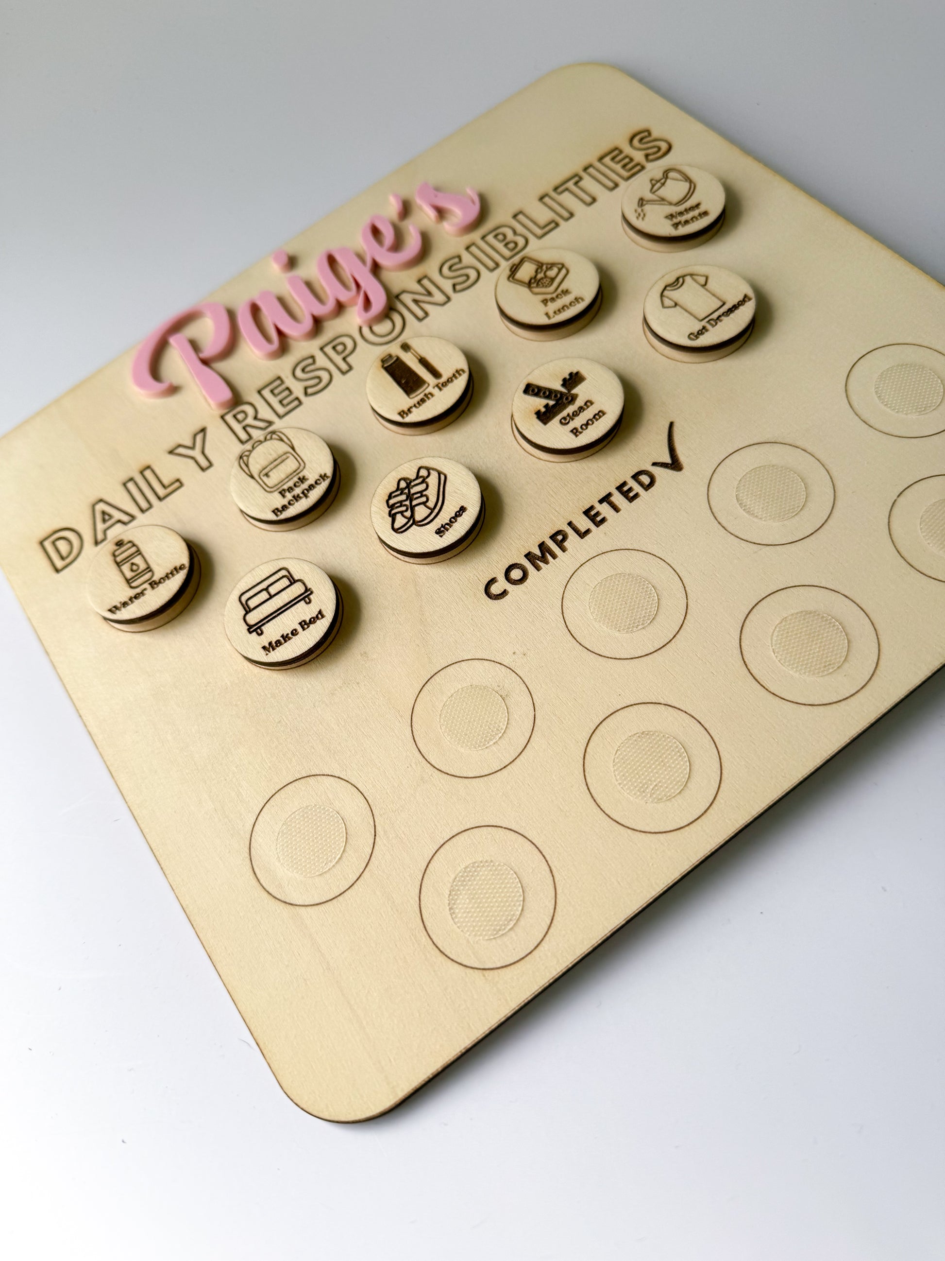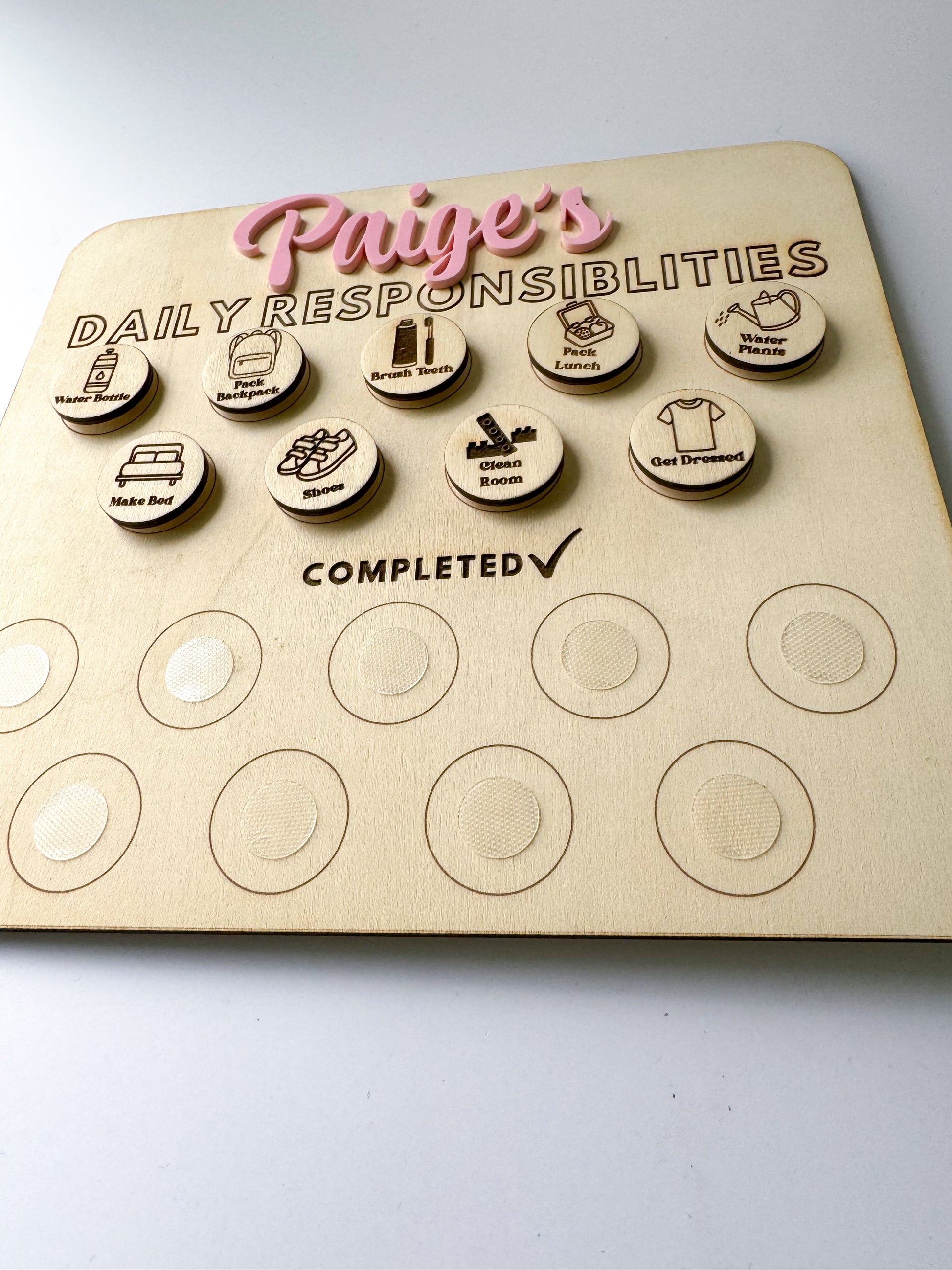 Help your kids stay on track with their daily tasks with our Kids Daily Routine! This wood chart utilizes velcro backed pieces to easily move between "to do" and "completed." Keep your little ones organized and on top of their responsibilities in a fun and interactive way. (No more nagging!)